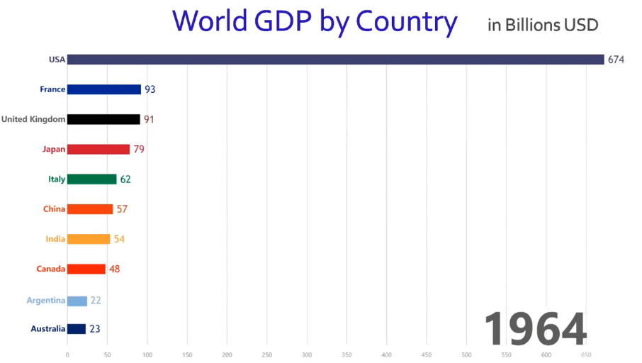 During the last 54 years the World Economy – the World GDP – has seen a lot of changes. The USA has grown continuously, Japan has grown, shrunk, grown. China has leap-frogged ahead of many. Click on the short video below to see the changes. Play VideoPlay Video